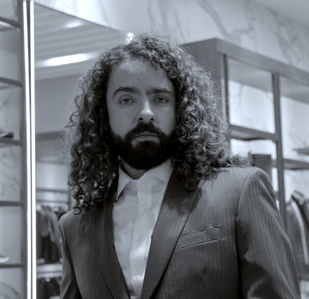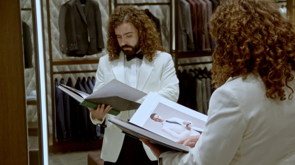El traje de Ibarreche fue desarrollado a través del proceso de Calderoni Couture, un servicio que permite crear una prenda completamente personalizada. Desde la selección del tejido hasta los detalles internos del traje, cada elemento se define en función de la ocasión y de la personalidad de quien lo porta.